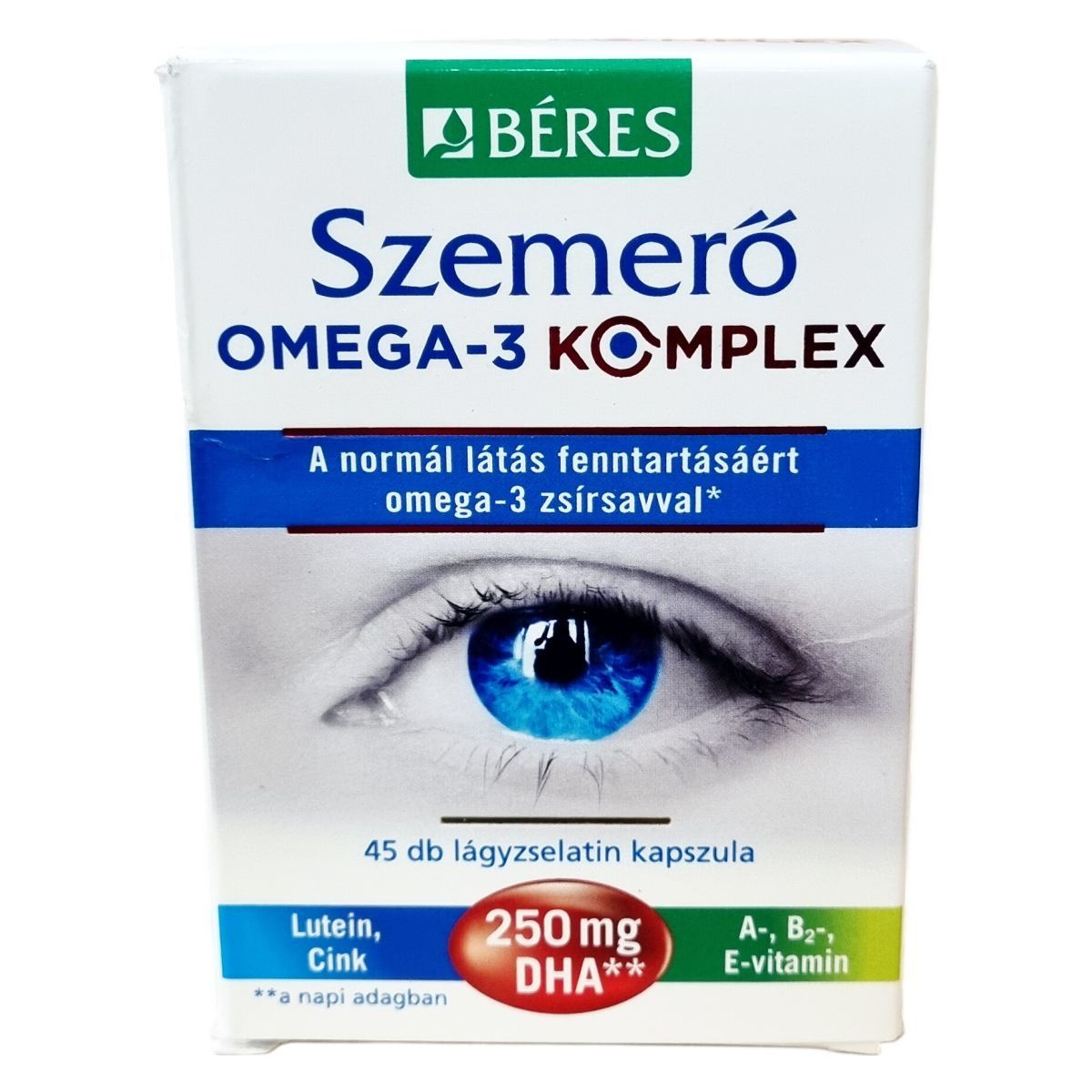 A Béres Szemerő Omega-3 KOMPLEX komplex étrend-kiegészítő készítmény, mely DHA omega-3 zsírsavat, cinket, A-, B2-, E-vitaminokat és luteint tartalmaz. A DHA egy többszörösen telítetlen omega-3 zsírsav, amely hozzájárulhat a normál látás fenntartásához. A kedvező hatás napi 250 mg dokozahexaénsav (DHA) bevitelével érhető el, ami 2 kapszulában található. Az A- és B2-vitamin szintén hozzájárulhat a normál látás fenntartásához, míg a cink hozzájárulhat a normál anyagcseréhez és a normál szellemi működés fenntartásához. Az E-vitamin antioxidáns hatásán keresztül segítheti a sejtek oxidatív stresszel szembeni védelmét. A lutein a retina és a szemlencse alkotóeleme, amely természetes forrásból, nagy bársonyvirág kivonatból származik. A termék ajánlott használati területei közé tartozik a megfelelő látás fenntartása, rossz fényviszonyok közötti munkavégzés, gyakori képernyőhasználat és jelentős szellemi igénybevétel. A kapszulákat napi két alkalommal, étkezés előtt érdemes bevenni, egy pohár vízzel.
