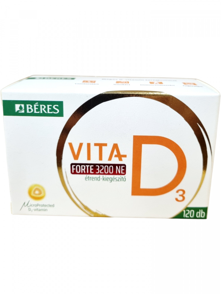 A Béres Vita-D Forte 3200 NE tabletta mikroenkapszulált D3-vitamin tartalmú étrend-kiegészítő, amely a szervezet D-vitamin ellátásához járulhat hozzá. A termék magas hatóanyag-tartalmának köszönhetően hozzájárulhat a csontozat, izmok, immunrendszer és a fogazat normál állapotának fenntartásához. A csomagolás 120 darab tablettát tartalmaz, ami hosszabb távú fogyasztást biztosít. A doboz jelzi, hogy a D-vitamin szerepet játszik a sejtosztódásban is. A készítmény magyar gyártású, és a jól ismert Béres minőség garanciájával kerül forgalomba.