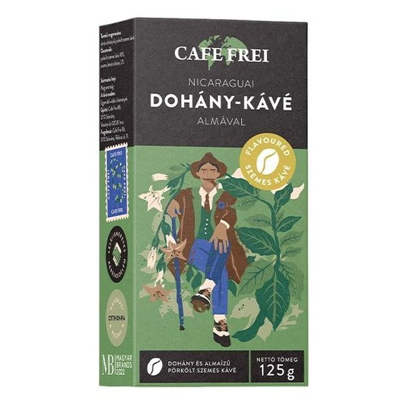 A Cafe Frei által fejlesztett, speciális pörkölés-technológiának köszönhetően az illatos, ízesített kávészemekből bármilyen otthoni kávéfőzési „módszerrel” elkészíthető ez a különleges ízű kávé. Kis adag cukor vagy méz, tehát az édesítés, kihangsúlyozza a kávé komplex karakterét. Ha pedig tejet is adunk hozzá, az tovább lágyítja az ízharmóniát. Egy csészényi közepes erősségű kávé elkészítéséhez javasolt adag: 2 púpos kiskanál őrölt kávé. Összetevők: Pörkölt pörkölt arabica szemes kávé 98%, almás dohány aroma 2%. Tartsa mindig lezárva, fénytől védve, lehetőség szerint hűvös helyen, de sosem a hűtőben! Mindig csak annyit őröljön le, amennyit épp elkészít!