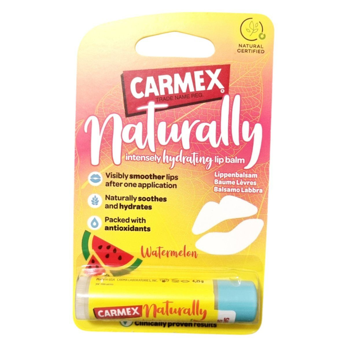 A Carmex Naturally ajakápoló több mint 93%-ban természetes összetevőket tartalmaz, beleértve a természetes olajokat és vajakat, amelyek feltételesen hozzájárulhatnak az ajkak ápolásához. Antioxidánsokban gazdag formulája segíthet a száraz és repedezett ajkak ápolásában, valamint hozzájárulhat a hosszan tartó hidratáltság fenntartásához. Klinikai vizsgálatok alapján már egyetlen alkalmazás után is láthatóan simábbá teheti az ajkakat. A dinnye íz frissítő élményt ad, miközben a természetes összetevők táplálják és védik az ajkakat a mindennapi környezeti hatásokkal szemben.