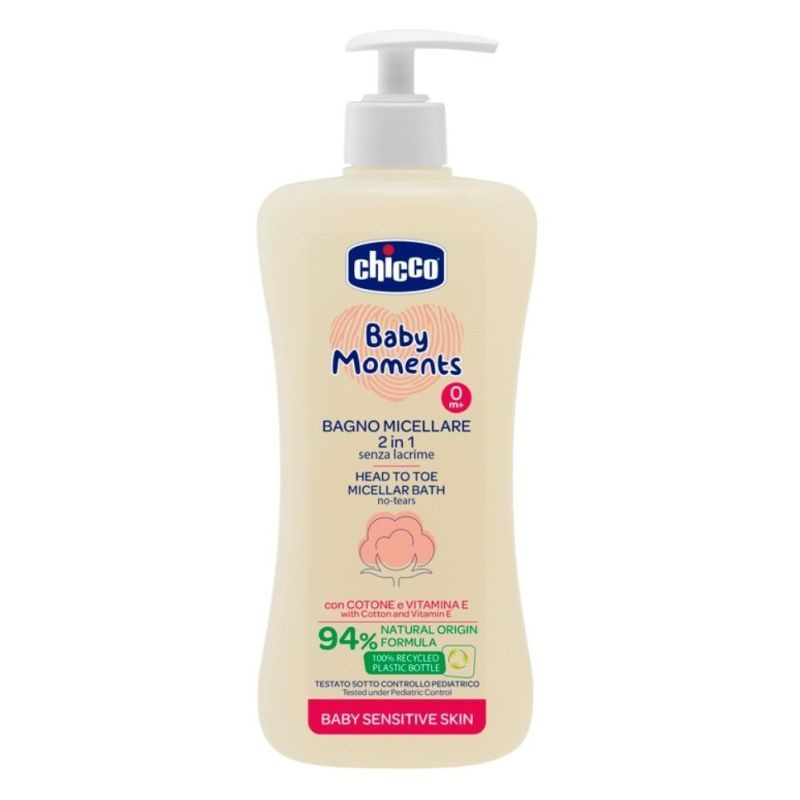A gyapotmagolajjal és E-vitaminnal dúsított 2in1 Chicco micellás fürdető ideális a baba napi higiéniájához és a kicsik bőrének táplálásához. Bőrgyógyászatilag és szemészetileg tesztelt, gyermekgyógyászati felügyelet mellett. 100% újrahasznosított műanyag, Kupak: PP polipropilén.