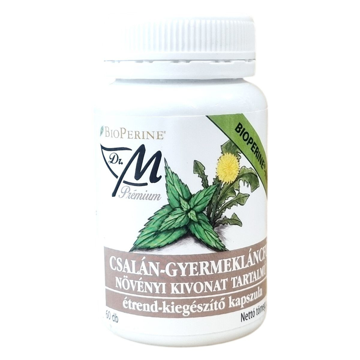 A BioPerine® Dr. M Prémium BIOPERINE+ CSALÁN-GYERMEKLÁNC növényi kivonat tartalmú étrend-kiegészítő kapszula elsősorban csalán- és gyermekláncfűgyökér-kivonatot valamint Bioperine® feketebors-kivonatot tartalmaz. Ezek az összetevők hozzájárulhatnak a vese kiválasztó funkciójának támogatásához és a húgyutak normál működéséhez. A termék zselatin kapszulában került előállításra, a napi adag egy kapszula. Fontos betartani az ajánlott napi adagot, és az étrend-kiegészítő szedése mellett törekedni a kiegyensúlyozott, vegyes étrendre és egészséges életmódra. A terméket gyermekek elől el kell zárni. A forgalmazó a Volmix Kft., melynek notifikációs száma 19187/2017.