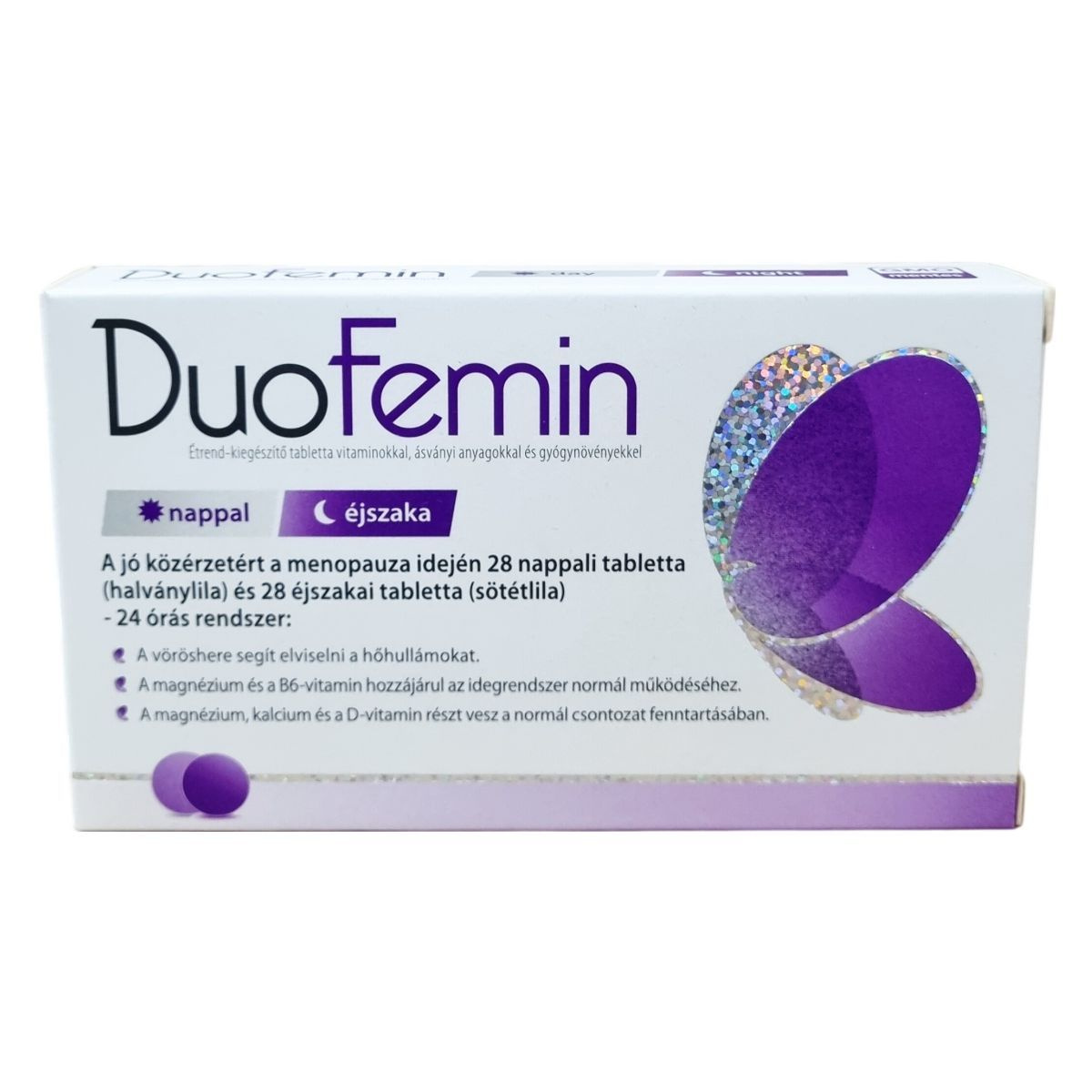 A DuoFemin egy speciális étrend-kiegészítő, amely nappali és éjszakai tablettákból áll, így 24 órás támogatást nyújthat a menopauza idején. A nappali tabletták fő hatóanyagai közé tartozik a vöröshere kivonat, amely segítheti a hőhullámok elviselését. A magnézium és B6-vitamin hozzájárulhat az idegrendszer normál működéséhez, valamint a magnézium, kalcium és D-vitamin támogatja a normál csontozat fenntartását. Az éjszakai tabletták tartalmaznak kalciumot, D3-vitamint, folsavat, szójabab-kivonatot és komlótermés port, melyek kombinációja hozzájárulhat a szervezet éjszakai regenerálódásához. Az adagolás egyszerű, naponta két tablettát szükséges bevenni, egyet reggel és egyet este, vízzel. Az allergén információ alapján szójababra allergiások számára nem ajánlott a termék szedése. A DuoFemin rendszeres használata mellett fontos a kiegyensúlyozott étrend és az egészséges életmód fenntartása.