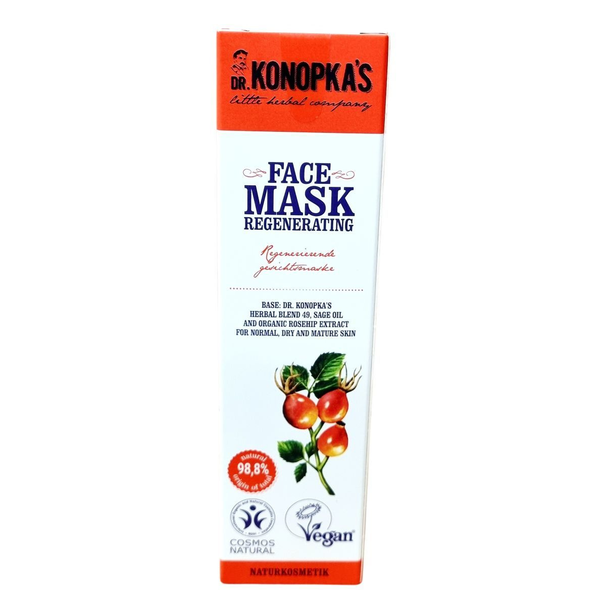 A Dr. Konopka's apró gyógynövényboltjában minden alkalomra találhat gyógyító készítményt. A regeneráló arcmaszk különleges, vitamindús és ásványi anyagokkal teli gyógynövény-esszencia alapján készült, amely a bőr táplálását és hidratálását segíti. A zsályaolajjal és organikus vadrózsa kivonattal kombinált formulája elősegíti a bőr regenerálódását, simábbá és ruganyosabbá téve azt. A termék 98,8%-ban természetes összetevőket tartalmaz, és megfelel a COSMOS NATURAL és Vegan természetes kozmetikai minősítéseknek, továbbá az európai GMP és ISO szabványoknak.