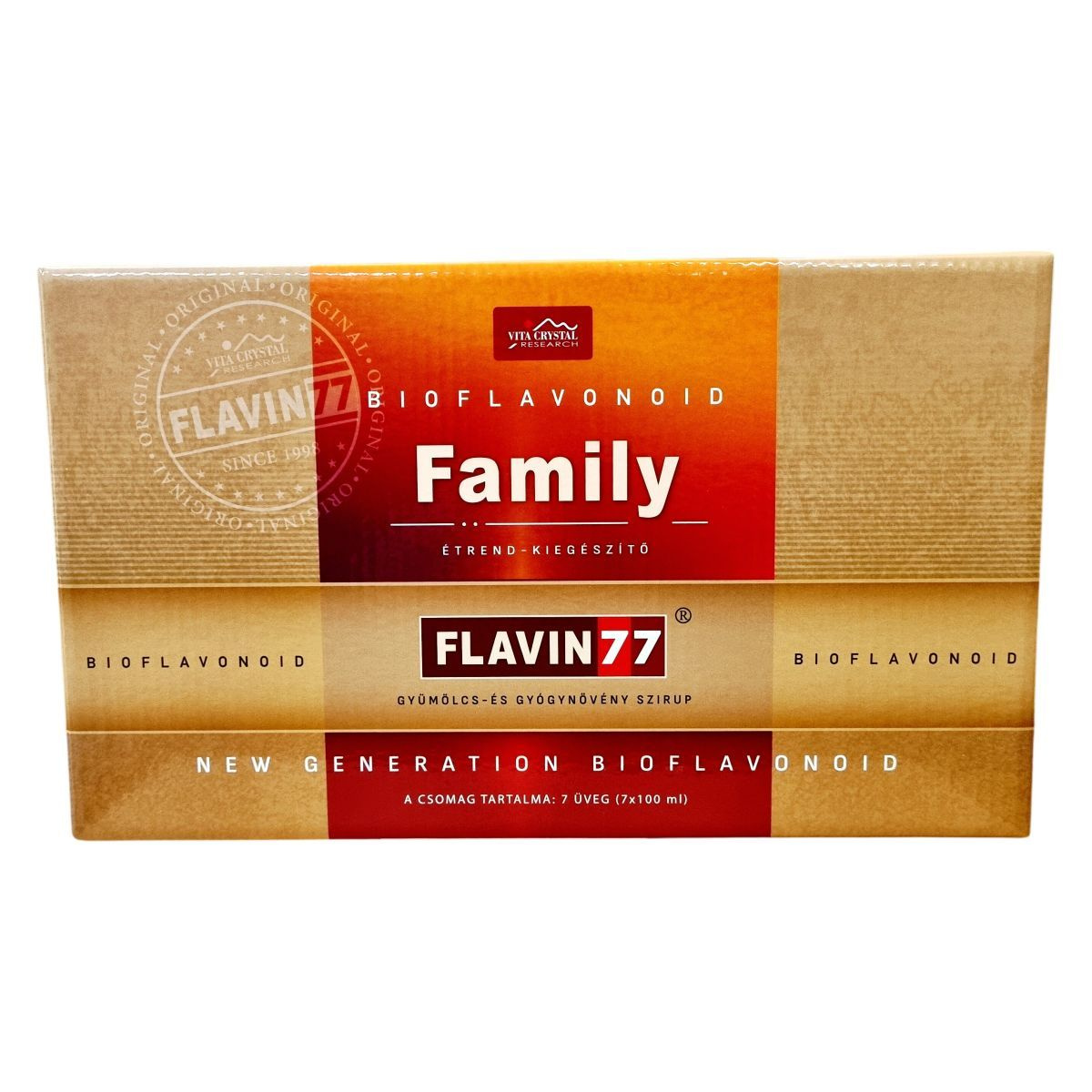 A FLAVIN 77 Family gyümölcs- és gyógynövény szirup 7 db 100 ml-es üvegből álló csomagban kerül forgalomba. A termék 77 féle különböző gyümölcs, virág, mag, gyógynövény, fűszer, gyökér és levél szárított őrleményét tartalmazza, melyek jelentős polifenol és flavonoid tartalommal rendelkeznek. Az összetevők között szerepelnek például alma, bodza, fekete áfonya, homoktövis, akácvirág, kamillavirág, ánizsmag, apróbojtorjánfű, bazsalikomlevél, kurkuma, valamint borsmenta és csalánlevél is. Az édesítését természetes stevia szteviol-glikoziddal végzik, továbbá meggyszár őrlemény is jelen van benne. A készítmény tartósítószer-mentes, ezért a felhasználásánál fontos odafigyelni a tárolásra és a higiéniai szabályokra, hogy az erjedést elkerüljék. Az ajánlott napi fogyasztási mennyiség 20 ml, maximum 50 ml lehet, amely hozzájárulhat a szervezet bioflavonoid- és polifenol ellátásához.