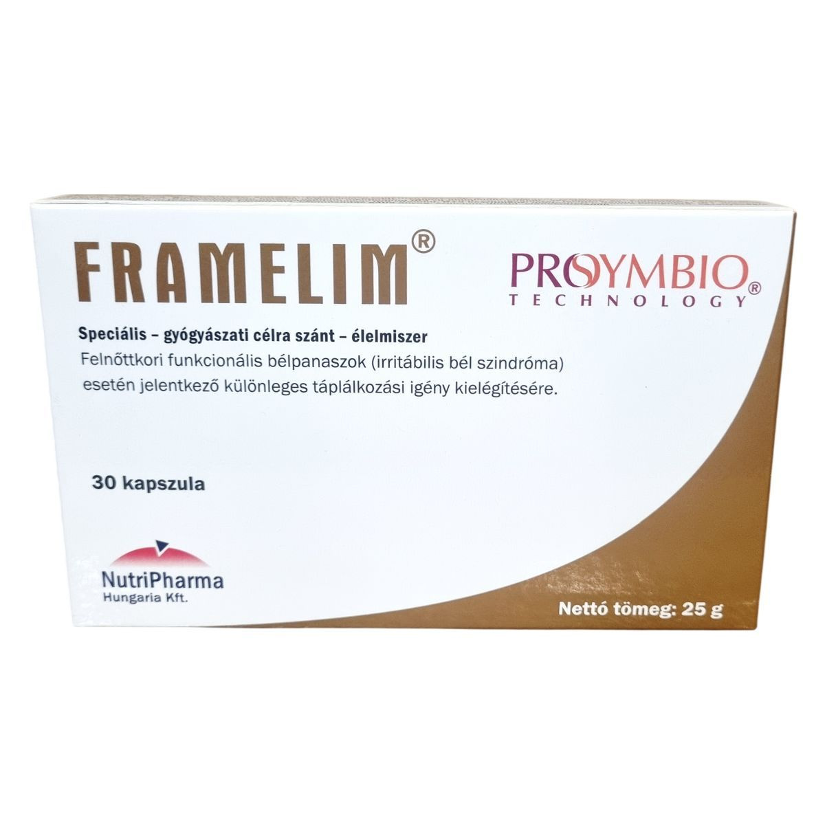 A Framelim® ProSymbio® speciális gyógyászati célra szánt élelmiszer, mely felnőttkori funkcionális bélpanaszok, például irritábilis bél szindróma esetén jelentkező táplálkozási igényekhez fejlesztett termék. A különleges formulában csukamájolaj található, amely gazdag omega-3 zsírsavakban, valamint A- és D-vitaminban. A készítmény baktérium lizátumokat tartalmaz Lactobacillus acidophilus és Bifidobacterium longum törzsekből, amelyek frakcionált hőkezeléssel készülnek. A kapszulák összetevői között szerepel továbbá több B-vitamin is, támogatva az anyagcsere folyamatokat. A termék nem használható önálló táplálékforrásként, és tejcukor-érzékenyek részére nem javasolt. Az adagolás napi három kapszula, legalább két hónapon át, az étkezés előtt vagy közben ajánlott. A tárolási feltételek között fontos a fénytől való védelem, a száraz környezet és a gyermekektől való elzárás. A készítményt orvosi ellenőrzés mellett szabad alkalmazni.