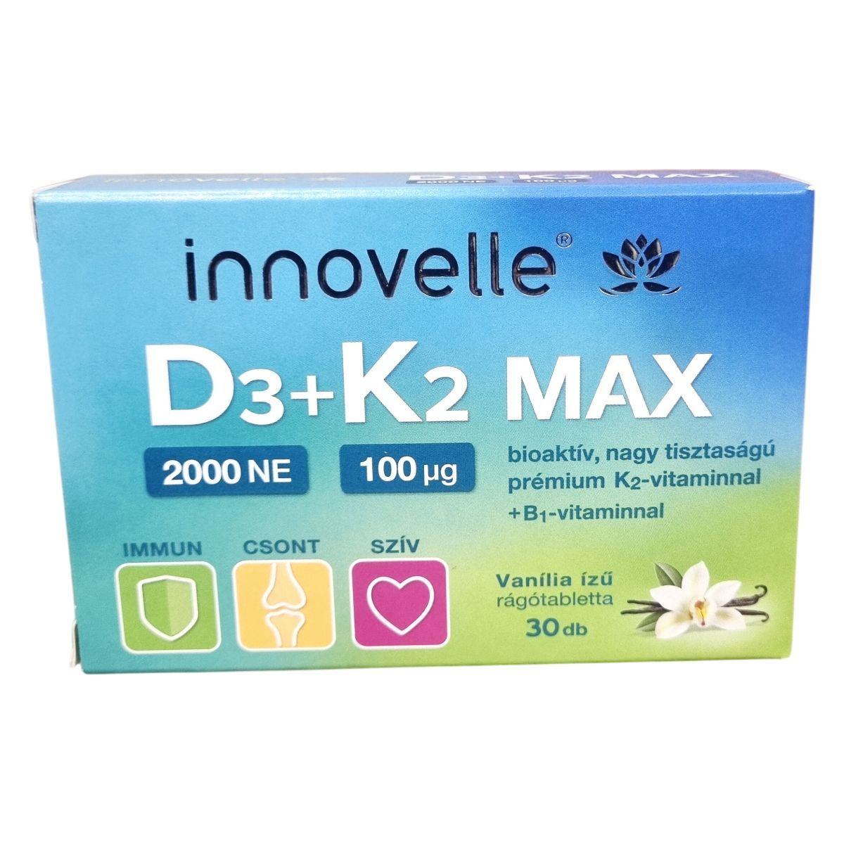 Az innovelle® D3+K2 MAX rágótabletta nagy mennyiségben tartalmaz prémium minőségű, virág kivonatból szerves szintézissel készült, mikrokapszulázott és bioaktív K2-vitamint (K2VITAL®), amely több mint 99% all-trans MK-7 tisztaságú. A D- és K2-vitamin hozzájárulhat az egészséges csontozat fenntartásához, a D-vitamin az immunrendszer normál működéséhez, a B1-vitamin a szív egészséges működéséhez, illetve a K2-vitamin a normál véralvadáshoz. A készítmény édesítőszerekkel ízesített vanília ízű rágótabletta formájában készült. Az elsődleges összetevő (izomalt) Németországból származik, míg a termék Magyarországon készül.