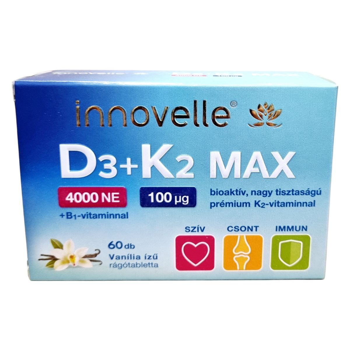 Az Innovelle® D3+K2 MAX rágótabletta prémium minőségű K2-vitamint, a K2VITAL®-t tartalmaz, amely virág kivonatból szerves szintézissel készült, nagy tisztaságú (több mint 99% all-trans MK-7) és mikrokapszulázott. A termék vanília ízű, édesítőszerrel készült, és a D- és K2-vitamin hozzájárulhat az egészséges csontozat fenntartásához, míg a D-vitamin az immunrendszer normál működéséhez, a B1-vitamin pedig a szív egészséges működéséhez járulhat hozzá. A termék nettó tömege 21 g (60 x 0,35 g).