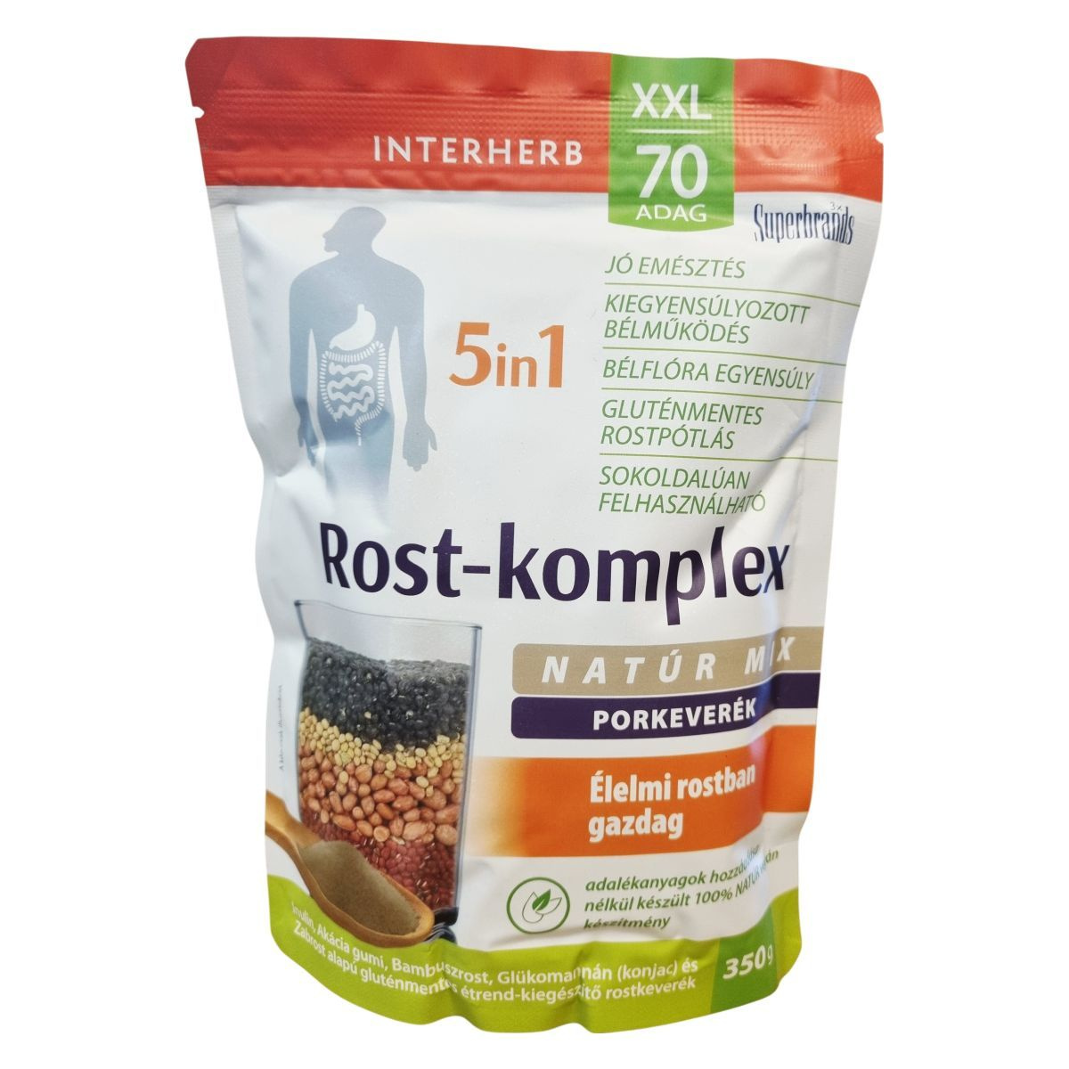 Az Interherb Rost-Komplex 5in1 rostkeverék az inulin, akácia gumi, bambuszrost, glükomannán (konjac) és zabrost kombinációján alapuló természetes, adalékanyagoktól mentes étrend-kiegészítő. A termék hozzájárulhat a normál bélműködés fenntartásához, a megfelelő székletmennyiség biztosításához és a bélflóra egyensúlyához, különösen mozgásszegény életmód esetén vagy olyan élethelyzetekben, amikor a bélműködés lassulhat. Az inulin komplex rostként segítheti a vastagbél hasznos baktériumainak növekedését. A rostok vízmegkötő, lágyító és bélmozgást fokozó hatásuk miatt támogathatják az emésztési folyamatokat. A hazai átlagos rostbevitel elmaradhat az ajánlott napi 30 grammtól, ezért a termék fokozatos, változatos rostfogyasztásban segítheti a kiegyensúlyozott táplálkozást. Natúr, ízesítetlen porkeverék, amely könnyen adagolható és sokféle ételbe vagy italba keverhető, miközben 100%-ban vegán és gluténmentes. A csomagolás 100%-ban újrahasznosítható, ezzel támogatva a környezetvédelmet.