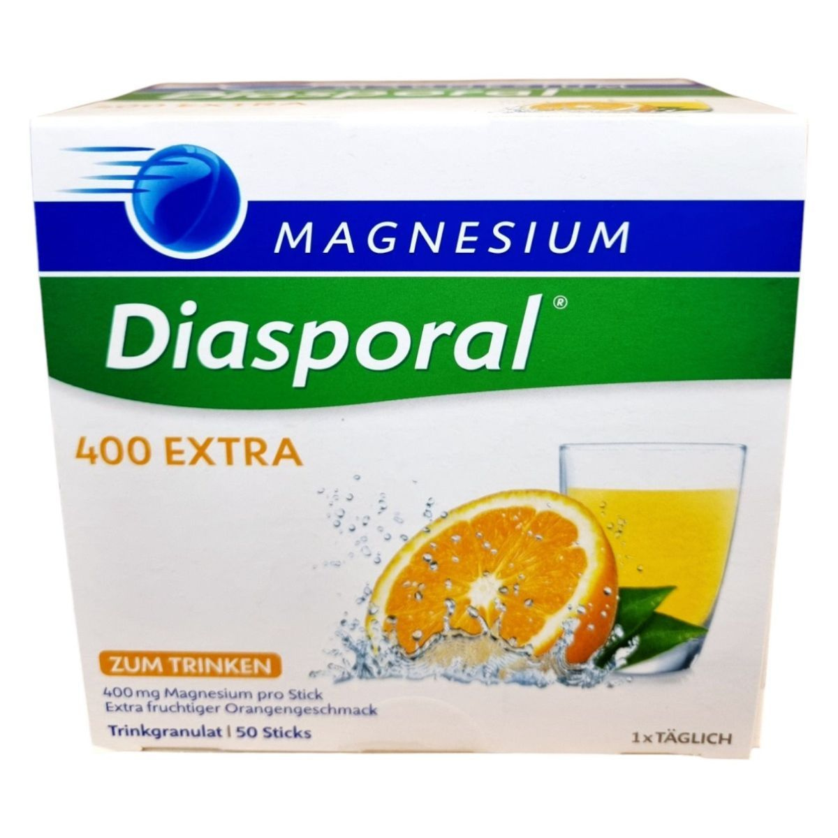 A Magnesium-Diasporal 400 Extra egy étrend-kiegészítő granulátum, amely tasakonként 400 mg magnéziumot tartalmaz magnézium-citrát formában. Az extra gyümölcsös narancs ízű készítmény édesítőszerrel van ízesítve, és 50 db 6,3 g granulátumot tartalmazó tasakot tartalmaz. A magnézium hozzájárulhat az izmok és az idegrendszer megfelelő működéséhez, a fáradtság és kifáradás csökkentéséhez, valamint a normál pszichológiai funkció, csontozat és fogazat fenntartásához. Ajánlható az étrend kiegészítésére várandós és szoptatós kismamáknak, fogyókúrázóknak, sportolóknak. A termék nem helyettesíti a kiegyensúlyozott, vegyes étrendet és az egészséges életmódot, és túlzott fogyasztása hashajtó hatású lehet. Gyártója a Protina Pharm. GmbH, forgalmazója pedig a Dr. Kocsis & Hoffmann Pharma Kft.