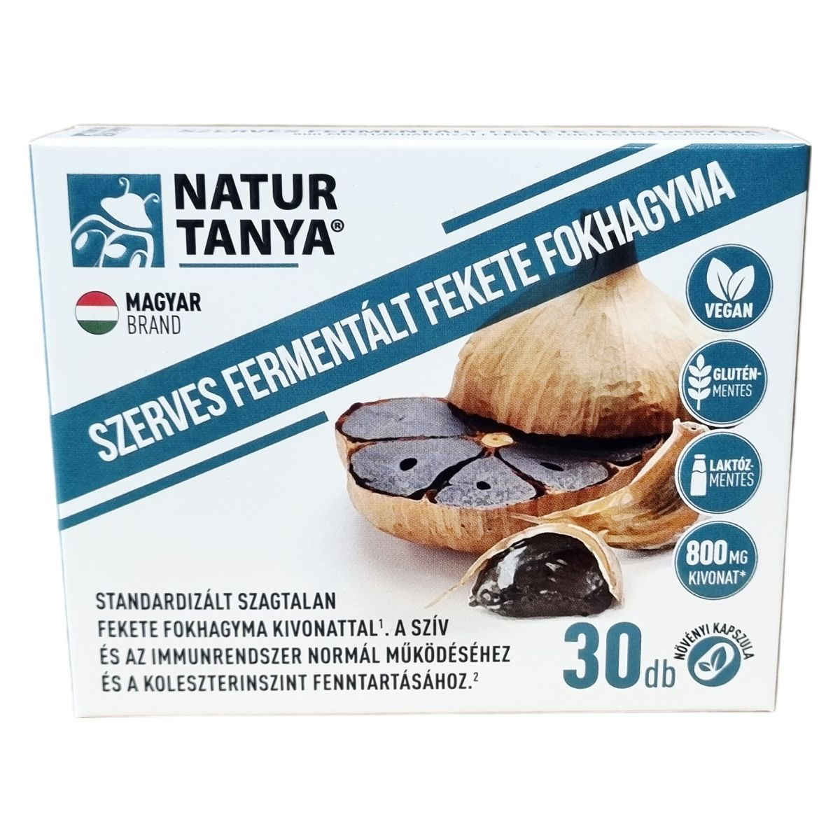A Natur Tanya® Szerves fermentált fekete fokhagyma étrend-kiegészítő növényi kapszula standardizált fekete fokhagyma kivonatot tartalmaz, amely nagy koncentrációban biztosítja az S-allil-ciszteint. A fekete fokhagymát friss fokhagymából állítják elő fermentációs eljárással, mely során a jellegzetes fehér szín barnás-feketévé válik, az erős íz pedig édeskés-sós karaktert kap. Ez a folyamat kb. 60 napon át zajlik, kontrollált hőmérséklet és magas páratartalom mellett, így stabil, vízoldékony, szerves kéntartalmú vegyületek alakulnak ki. A fermentált kivonat szagtalan, mivel a fokhagyma szúrós szagáért felelős összetevők jelentősen csökkennek. A termék 800 mg fekete fokhagyma kivonatot tartalmaz napi adagban, amely 12 000 mg porított fokhagyma őrleménynek felel meg. A készítmény támogatná a szív- és immunrendszer normál működését, valamint hozzájárulhat a homocisztein- és koleszterinszint fenntartásához. A termék növényi kapszulában, glutén- és laktózmentes, vegán étrendbe is beilleszthető. Nem tartalmaz mesterséges tartósítószert, színezéket és aromát, valamint Magyarországon készül, ezáltal magyar munkahelyeket támogat.