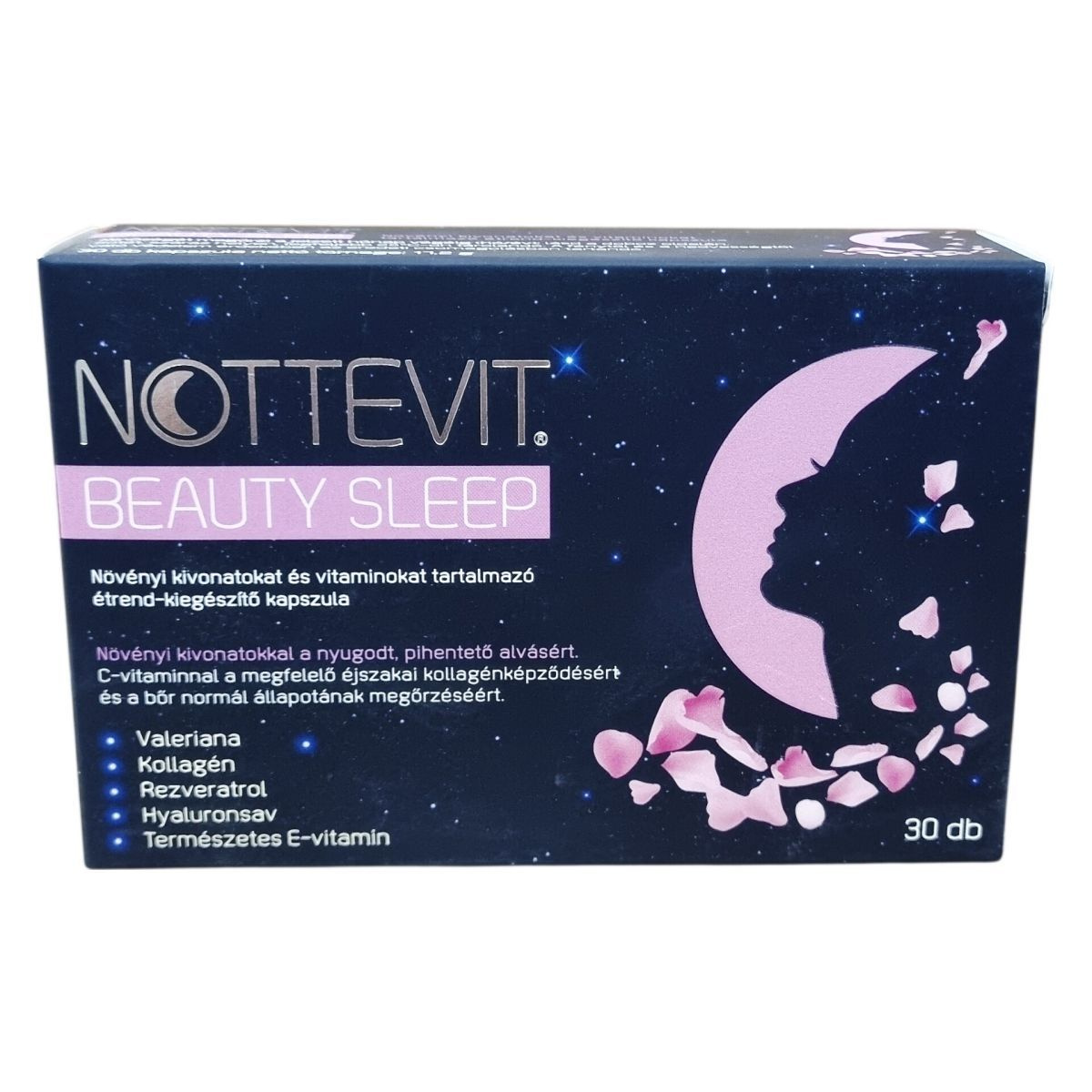 A Nottevit Beauty Sleep kapszula a nyugodt és egészséges alvás támogatására fejlesztett készítmény, mely macskagyökér, komló és golgotavirág kivonatokat tartalmaz. Ezen kívül Naticol® kollagén peptidet, hyaluronsavat, természetes E-vitamint és Veri-te™ transz-rezveratrolt is magában foglal. A C-vitamin hozzájárulhat a megfelelő kollagénképződéshez, míg a biotin a bőr normál állapotának fenntartását támogathatja. Az E-vitamin szerepet játszhat a sejtek oxidatív stresszel szembeni védelmében is. A termék 30 db kapszulát tartalmaz, nettó tömege 11,2 g. A csomagoláson FSC® minősítés és megbízható forrás jelölése szerepel. A termék származási helye az Európai Unió. A kapszulák növényi alapúak, melyek a pihentető alvás és a bőr egészségének megőrzését támogathatják.