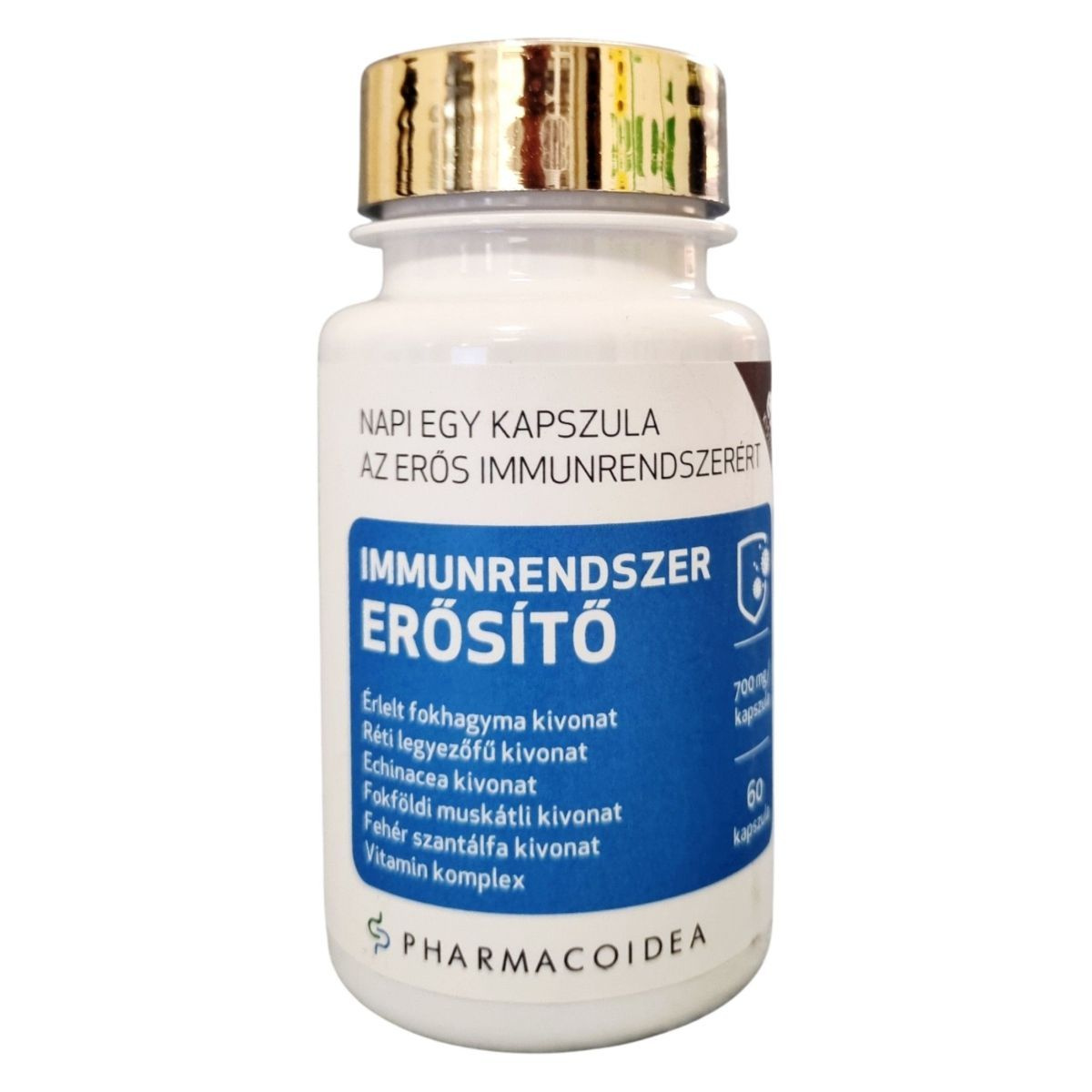 Az IMMUNRENDSZER ERŐSÍTŐ étrend-kiegészítő kapszula formájában érhető el, és különböző növényi kivonatokat, valamint vitaminokat tartalmaz. A termék célja, hogy hozzájáruljon az immunrendszer egészséges működéséhez, támogassa a szervezet ellenállóképességét, és segítse a fáradtságérzet csökkentését. Az összetevők között megtalálható az érlelt fokhagyma, a réti legyezőfű, az echinacea, a fokföldi muskátli és a fehér szantálfa kivonata, valamint egy vitamin komplex, amely többek között C-, E-, B6-, A-, D3- és B12-vitamint tartalmaz. A terméket a Pharmacoidea Kft. gyártja Szegeden.