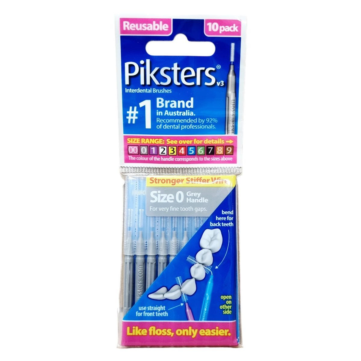 A Piksters fogköztisztító kefék kiváló minőségű, erős és merev dróttal rendelkeznek, így nem görbülnek el a használat során. A kefék többféle méretben érhetők el (00-tól 9-ig), a nyél színe a méretet jelzi. Méret 0 szürke nyéllel rendelkezik, nagyon finom fogközökhöz. A kefe használható egy kézzel, a hátsó fogakhoz a nyelet hajlítsa meg, míg az első fogakhoz egyenesen tartsa. A fogköztisztító kefe használata hasonló a fogselyeméhez, de sokak számára könnyebb megoldást jelent. A Piksters az ausztráliai piac legnépszerűbb márkája, melyet a fogászati szakemberek 92%-a ajánl. A termék használata elősegíti a plakk és ételmaradék eltávolítását, amelyek hozzájárulhatnak az ínybetegségek és a kellemetlen szájszag kialakulásához. A termék tervezték Ausztráliában, de Kínában gyártják.