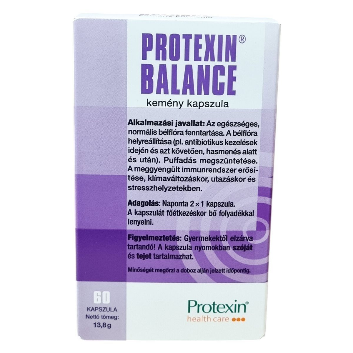 A Protexin® BALANCE gyógyszernek nem minősülő gyógyhatású készítmény, melynek hatását szakirodalmi adatok igazolják. Hatóanyagai olyan élő probiotikus baktériumok, melyek a szervezet egészséges bélflórájának alkotóelemei. A termék alkalmazható az egészséges bélflóra fenntartására és helyreállítására, például antibiotikus kezelések idején és után, valamint hasmenés alatt és azt követően. Segítheti a puffadás megszüntetését, a meggyengült immunrendszer támogatását, valamint alkalmazható klímaváltozáskor, utazáskor és stresszhelyzetekben. A kapszula 100 millió (10^8) élő probiotikus baktérium csírát tartalmaz, valamint hatást fokozó prebiotikumként frukto-oligoszacharidot (inulint). A kapszulahéj hipromellózból és titán-dioxidból (E171) készül.