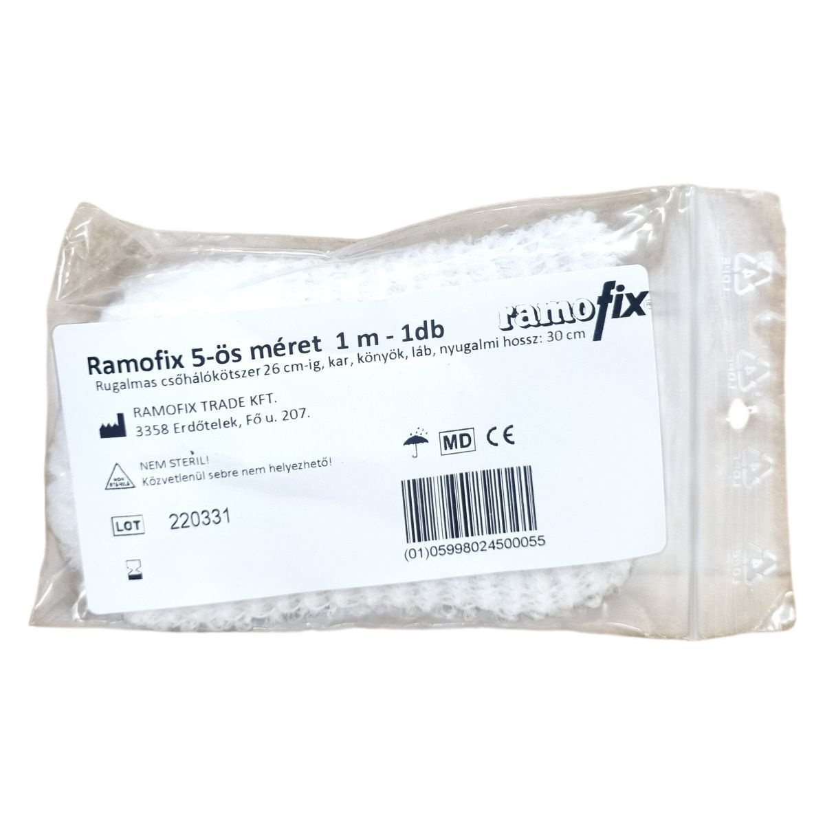 A Ramofix 5-ös méretű rugalmas csőhálókötszer egy 1 méter hosszú termék, melyet egy darabban kínálnak. A kötés alkalmazható a karon, könyökön és lábon, nyugalmi hosszúsága 30 cm, és 26 cm-es átmérőig alkalmas. A termék nem steril, ezért közvetlenül sebre nem szabad helyezni. A csőháló anyaga LDPE, amely biztosítja a rugalmasságot és tartósságot. A termékhez a gyártó a RAMOFIX TRADE KFT., mely Erdőteleken, a Fő u. 207. szám alatt található. A termékhez az MD és CE tanúsítványok társulnak. Lot szám: 220331, cikkszám: 270330.