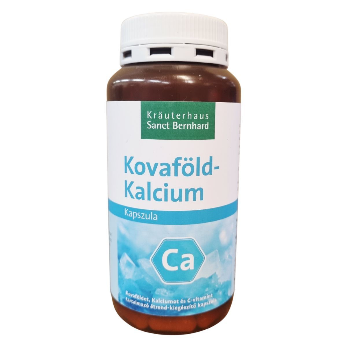 A Kräuterhaus Sanct Bernhard Kovaföld-Kalcium kapszula egy olyan étrend-kiegészítő, amely a kovaföld, kalcium és C-vitamin kombinációját tartalmazza. A C-vitamin hozzájárulhat a normál kollagénképződéshez és ezáltal a bőr normál állapotának fenntartásához. A termék 210 kapszulát tartalmaz, amelyek összsúlya 103 gramm. Az adagolás felnőttek számára napi három kapszula, amelyeket bőséges folyadékkal kell bevenni, szétrágás nélkül. A kapszula alapanyagai között szerepel zselatin kapszulahéj, kukoricakeményítő töltőanyagként, valamint csomósodást gátló anyagok. A termék Németországban készül. Tárolása javasolt hűvös és száraz, fénytől védett helyen, 15-25 Celsius-fokon. Gyermekektől elzárva kell tartani. A termék nem helyettesíti a vegyes étrendet vagy az egészséges életmódot.