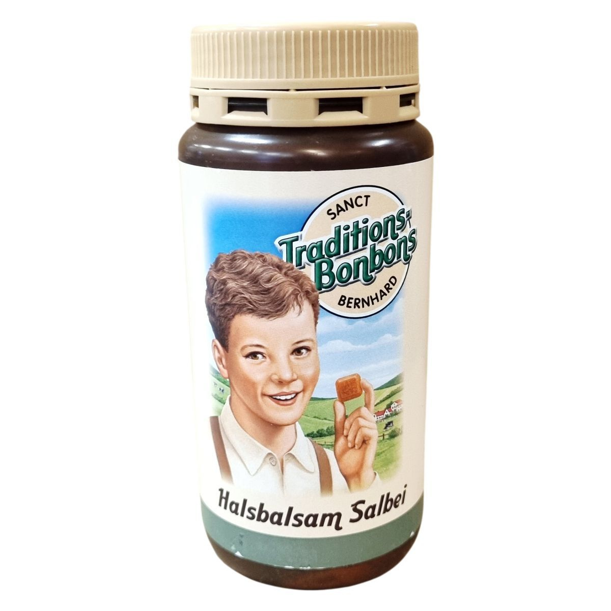 A SANCT Traditions-Bonbons BERNHARD Halsbalsam Salbei egy zsályával készült torokcukorka, amely cukrot és glükózszirupot tartalmaz. A termék kivonatot és olajat tartalmaz a zsályalevelekből, és Németországban készül. Nettó tömege 170 g. A tárolást hűvös, száraz helyen, 25 °C alatt javasolt végezni.