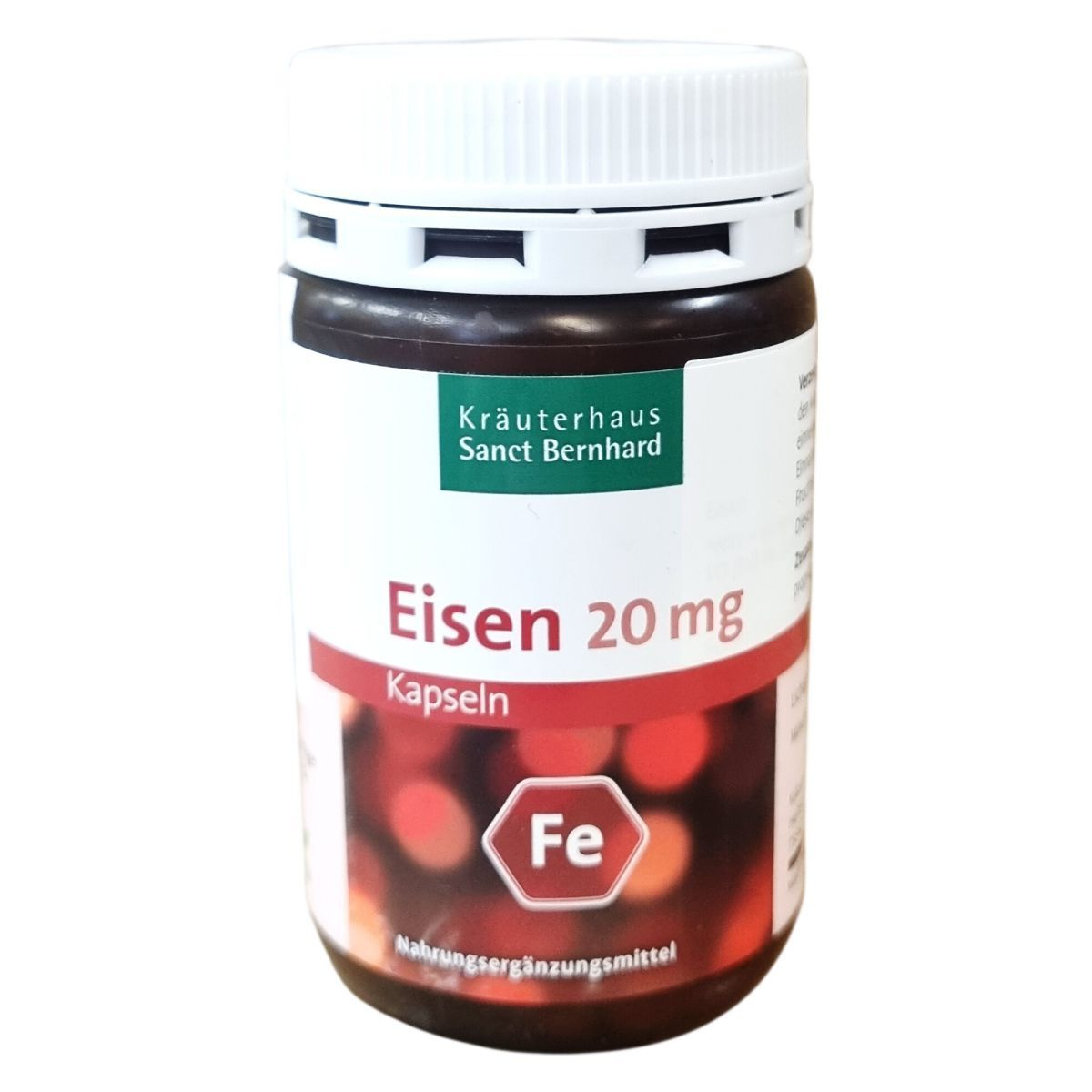 A Kräuterhaus Sanct Bernhard Eisen 20 mg kapszula Németországban készült vas tartalmú étrend-kiegészítő, amely vas-(II)-glükonátot tartalmaz. Egy doboz 120 kapszulát (49 g) foglal magában. A termék fogyasztása javíthatja a szervezet vasellátását, ami kiemelten fontos menstruáció, terhesség, szoptatás és eltérő táplálkozási szokások esetén. Az optimális felszívódás érdekében a kapszulát javasolt vitamin C-tartalmú itallal vagy tablettával egyidejűleg bevenni. A terméket gyermekek nem fogyaszthatják. A kapszulákhoz mesterséges csomósodásgátló anyagként zsírsavak magnéziumsóit használják. A tárolás hűvös, szár száraz és 25 °C alatti hőmérsékleten ajánlott. A márka és gyártó a Kräuterhaus Sanct Bernhard KG, a forgalmazó pedig az ODP Vital Kft.