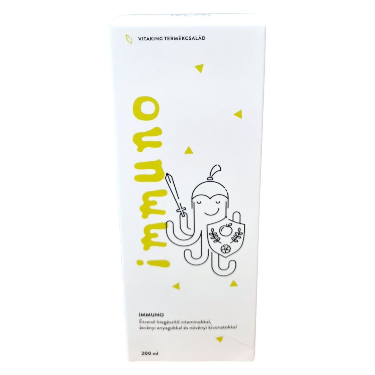 A Vitaking Immuno étrend-kiegészítő egy komplex készítmény, amely vitaminokat, ásványi anyagokat és növényi kivonatokat tartalmaz. A termék célja, hogy támogassa az immunrendszer normál működését. Az összetevők között megtalálható az astragalus gyökér, csipkebogyó gyümölcs és szibériai ginzeng, amelyek tradicionálisan használt növényi kivonatok. A B6-vitamin, cink és réz hozzájárulhatnak az immunrendszer normál működéséhez. A termék 200 ml-es kiszerelésben kapható, és napi egy evőkanál fogyasztása javasolt.